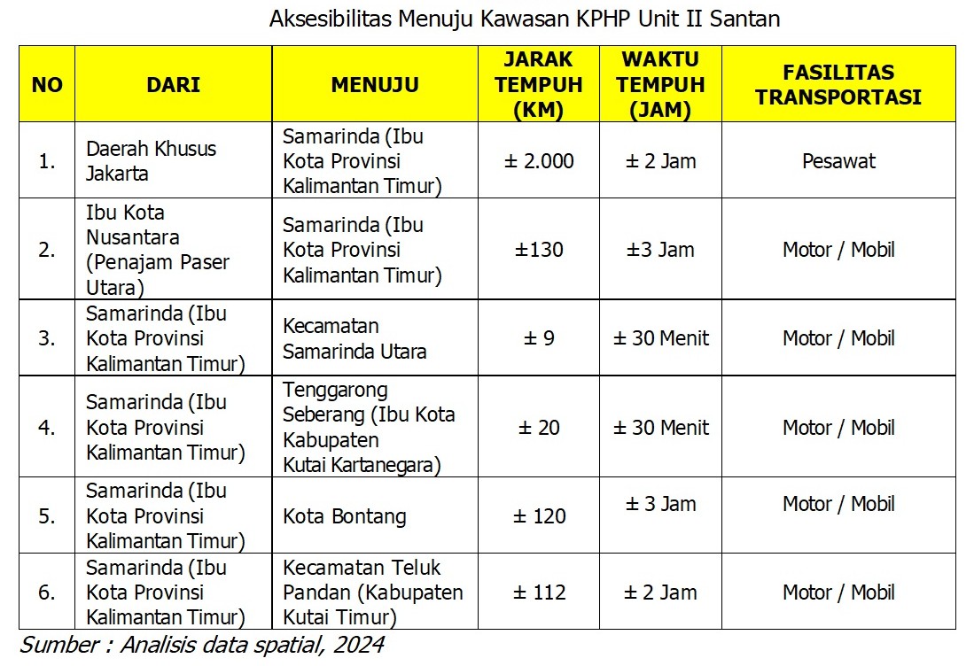 Untuk dapat menuju ke wilayah KPHP Unit II pada UPTD KPHP Santan dapat ditempuh dengan menggunakan pesawat terbang, mobil/motor atau kapal. Wilayah KPHP Unit II pada UPTD KPHP Santan meliputi 12 (Dua Belas) kecamatan di 4 Kabupaten/Kota. Semua kecamatan tersedia transportasi umum yang bersifat reguler.