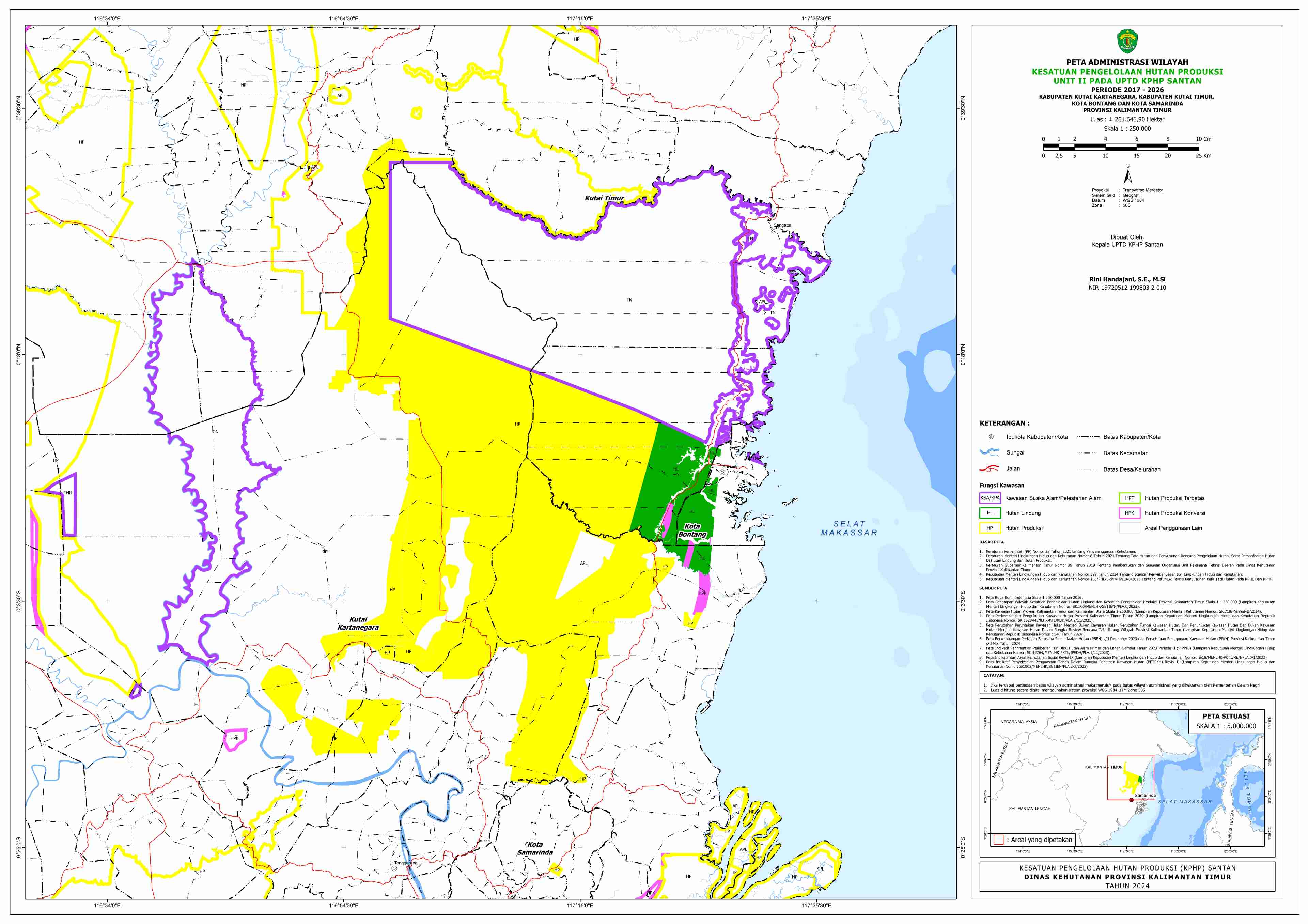 Luas Wilayah KPHP Unit II Santan berdasarkan Keputusan Menteri Kehutanan tentang Penetapan Wilayah KPHL dan KPHP Provinsi Kalimantan Timur Nomor : SK.674/Menhut-II/2011, Tanggal 1 Desember 2011 yaitu seluas ±270.557 Ha. Kemudian disesuaikan Keputusan Menteri Kehutanan Nomor : SK. 718/Menhut-II/2014 Tentang Kawasan Hutan Provinsi Kalimantan Timur dan Provinsi Kalimantan Utara dan peta perkembangan tata batas oleh BPKH wilayah IV Samarinda, sehingga Luas KPHP Santan menjadi ±267.068 Ha. Kemudian berdasarkan Keputusan Menteri Lingkungan Hidup dan Kehutanan Nomor SK.560/MENLHK/SETJEN /PLA.0/6/2023 tanggal 6 Juni 2023 Tentang Penetapan Wilayah Kesatuan Pengelolaan Hutan Lindung Dan Kesatuan Pengelolaan Hutan Produksi Provinsi Kalimantan Timur, luasnya menjadi ±264.805 Ha. Berdasarkan Keputusan Menteri Lingkungan Hidup dan Kehutanan Nomor 548 Tahun 2024 tanggal 13 Mei 2024 Tentang Perubahan Peruntukan Kawasan Hutan menjadi Bukan Kawasan Hutan, Perubahan Fungsi Kawasan Hutan, dan Penunjukan Kawasan Hutan dari Bukan Kawasan Hutan menjadi Kawasan Hutan dalam rangka Review Rencana Tata Ruang Wilayah Provinsi Kalimantan Timur, luasnya menjadi 261.646,90 Ha.